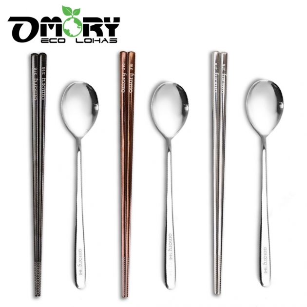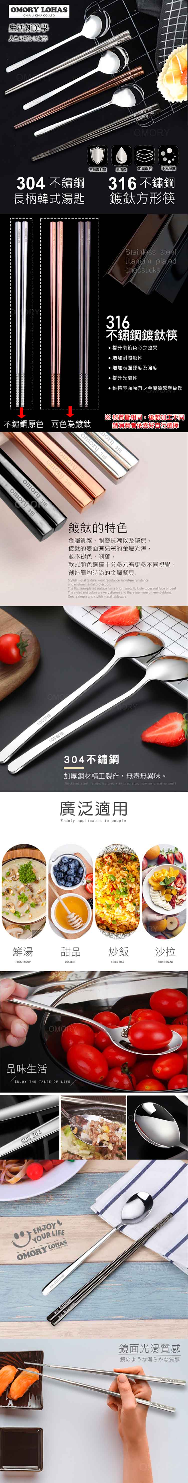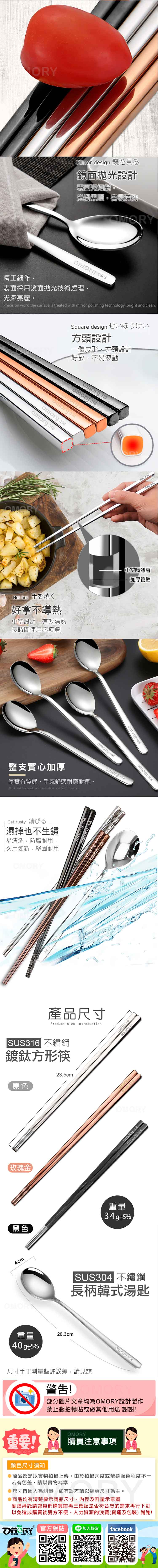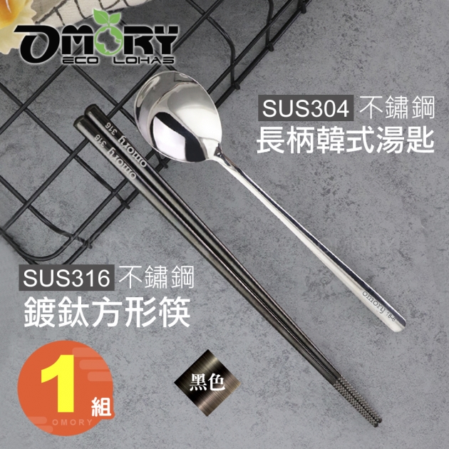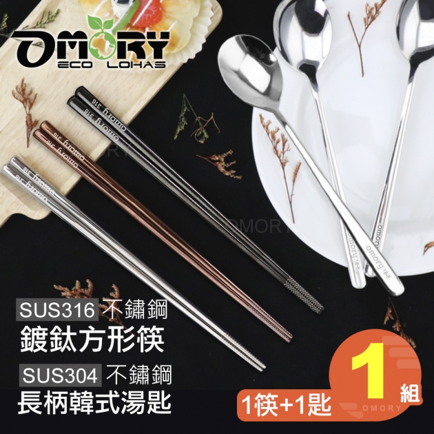 【OMORY】316不鏽鋼鍍鈦方形筷23.5cm + 304不鏽鋼長柄韓式湯匙